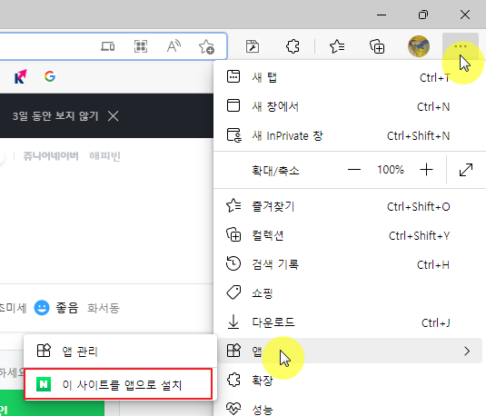 점세개 눌러주시고, 앱->이사이트를 앱으로 설치 클릭해주면 됩니다! 아무래도 앱과 같다 생각했는데 엣지는 아예 바로가기라고 안하고 앱이라고 대놓고 쓰고 있네요