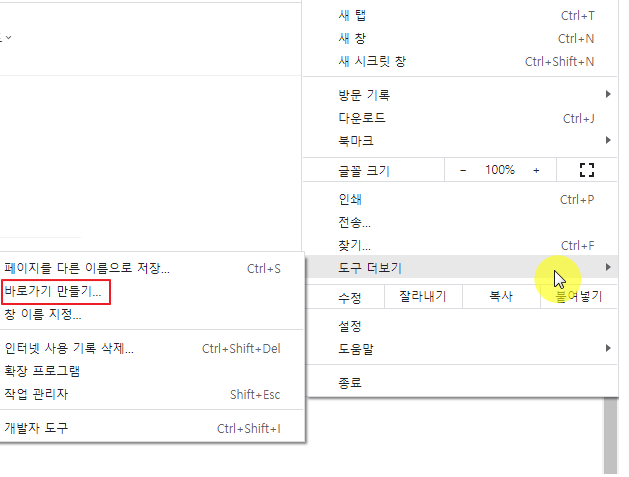 도구 더보기->바로가기 만들기를 누르면 됩니다. 도구 더보기는 세로 점 세개 누르면 됩니다.