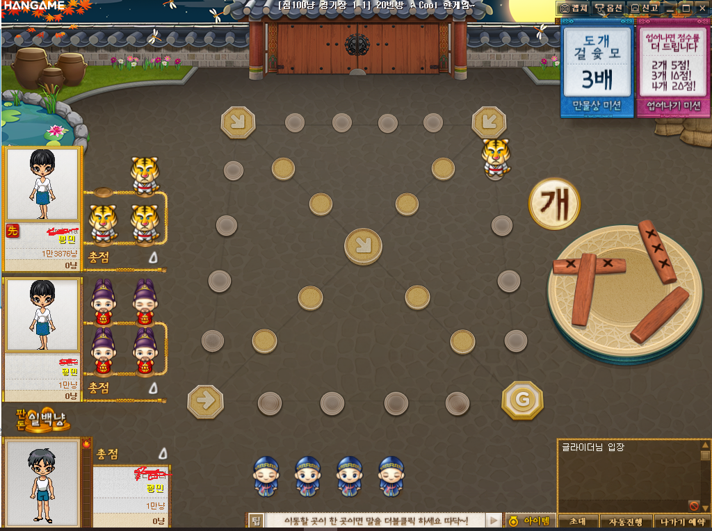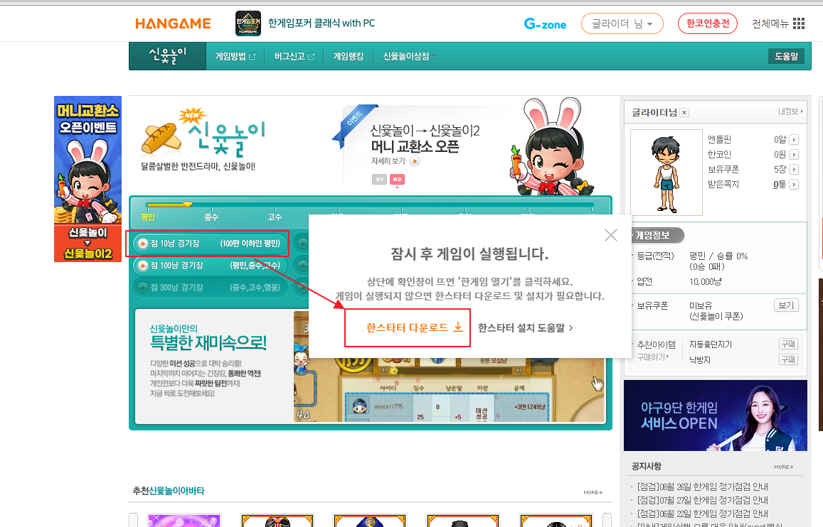 점 10냥 경기장에 들어가 줍니다. 그러면 한스타터 다운로드 창이 뜨는데 진행하시면 됩니다. (최근 들어가보니 신윷놀이로 들어갈건지 물어보던데 아래에 구윷놀이 버튼이 있으니 그것을 눌러줍시다. 또한 혹시 채널에 사람이 적다면 100냥 경기장에 들어가시면 됩니다.)