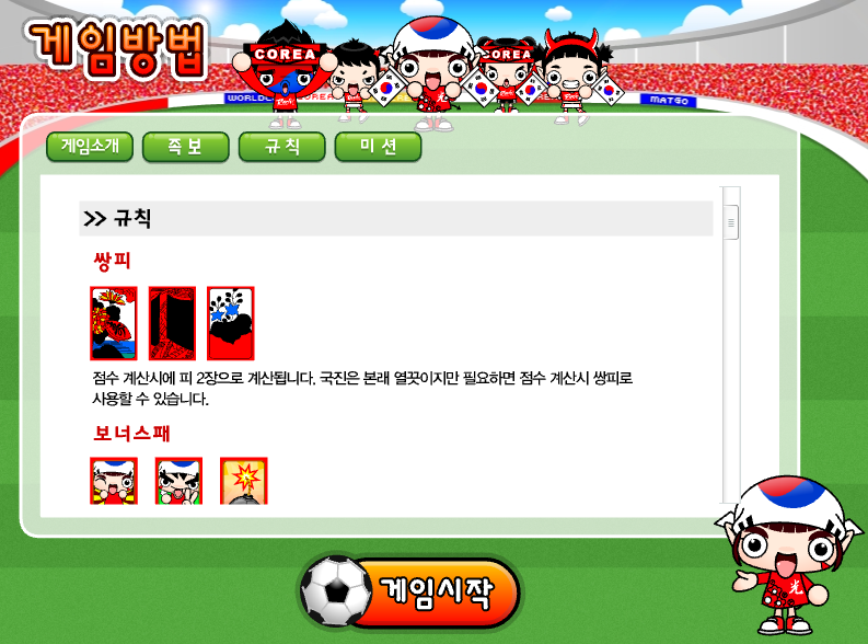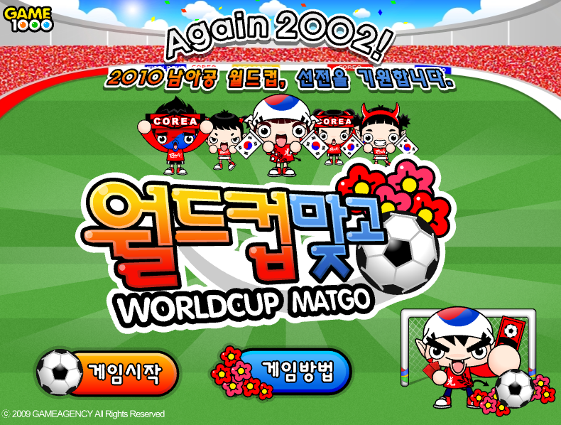 월드컵 맞고란 게임인데요. 제목 그대로 월드컵 경기+맞고라 맞고를 하면서 월드컵 경기 스타일로 진행을 합니다. 실제 축구선수 이름이 우리의 대적상대이지요. 플래시형태로 회원가입 없이도 게임을 즐길 수가 있습니다. 아래 사이트 주소입니다.