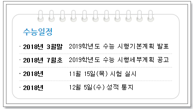 2019 수능 날짜 저도 수능을 치른게 엊그제 같은데 벌써 꽤 많은 시간이 지났더군요. 저때만해도 수능 등급에 따라 대학간판이 바뀌고했으니 수능이란 정말 악착같이 준비하여야 하던 시험이었죠. 여러분때는 뭐 수시 비중이 늘어나서 정시 비중이 대폭 줄어들어 수능 시험의 절대성이 떨어졌다곤 하나 아직도 수능이란 중요한 시험이죠. 또한 수능이란것이 하루 아침 준비한다고 해서 많은 점수를 받고 하는 시험이 아니기 때문에 미리미리 며칠날일 수능 날짜인지 확인 할 필요가 있죠. 따라서 이번에 수능을 치르는 고3수험생 분들을 위해 2019 수능 날짜 한번 알아보았습니다.