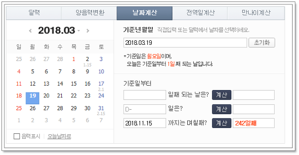 현재 포스팅 작성 시간이 3월 19일이거든요. 이 기준으로 11. 15일까지는 242일 됩니다. 이러한 정보는 네이버 날짜계산기를 통해 알 수 있습니다. 수능 D-day 알고 싶은분들은 네이버 날짜계산기를 잘 활용하시면 도움 될 겁니다.