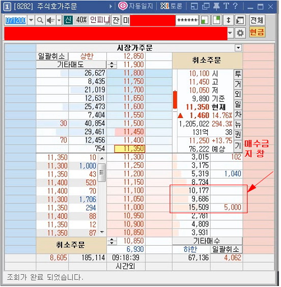 저 호가창을 잘 기억하시길 바랍니다. 저경우는 상승하는 도중 매수호가에 없던 물량이 서서히 5-6-7호가에 쌓이는 모습입니다 저런경우는 절대 매수금지입니다.