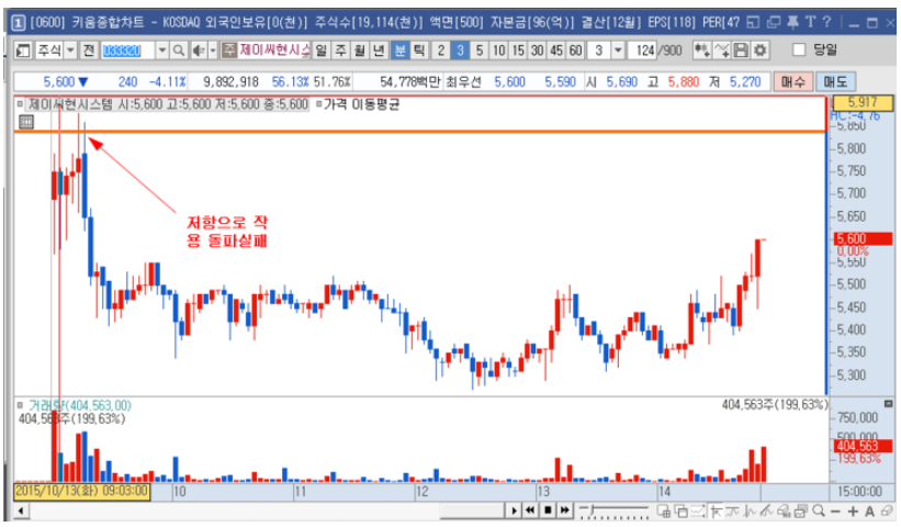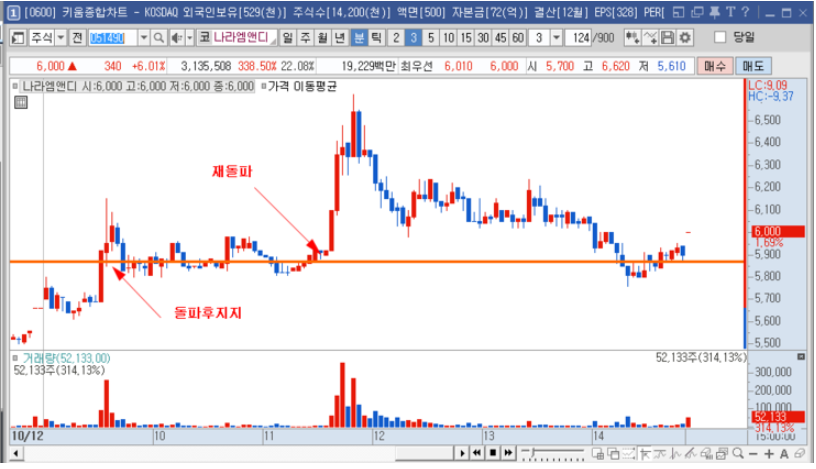 돌파매매에서 가장 중요한건 무엇일까요? 바로 3분봉 상 전일고점을 뚫었는지가 가장 중요합니다. 아래 제가 올려 놓은 차트에서 주황색 선이 바로 전일 고점 자리입니다.