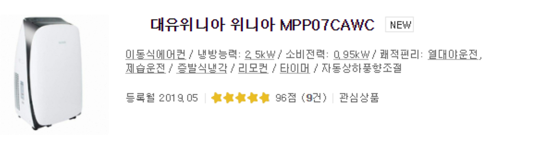 위니아 MPP07CAWC입니다. 2019년 5월에 출시된 제품이며 냉방능력은 2.5KW 됩니다. 이 정도는 방 3~4평을 냉방하는데 충분합니다!