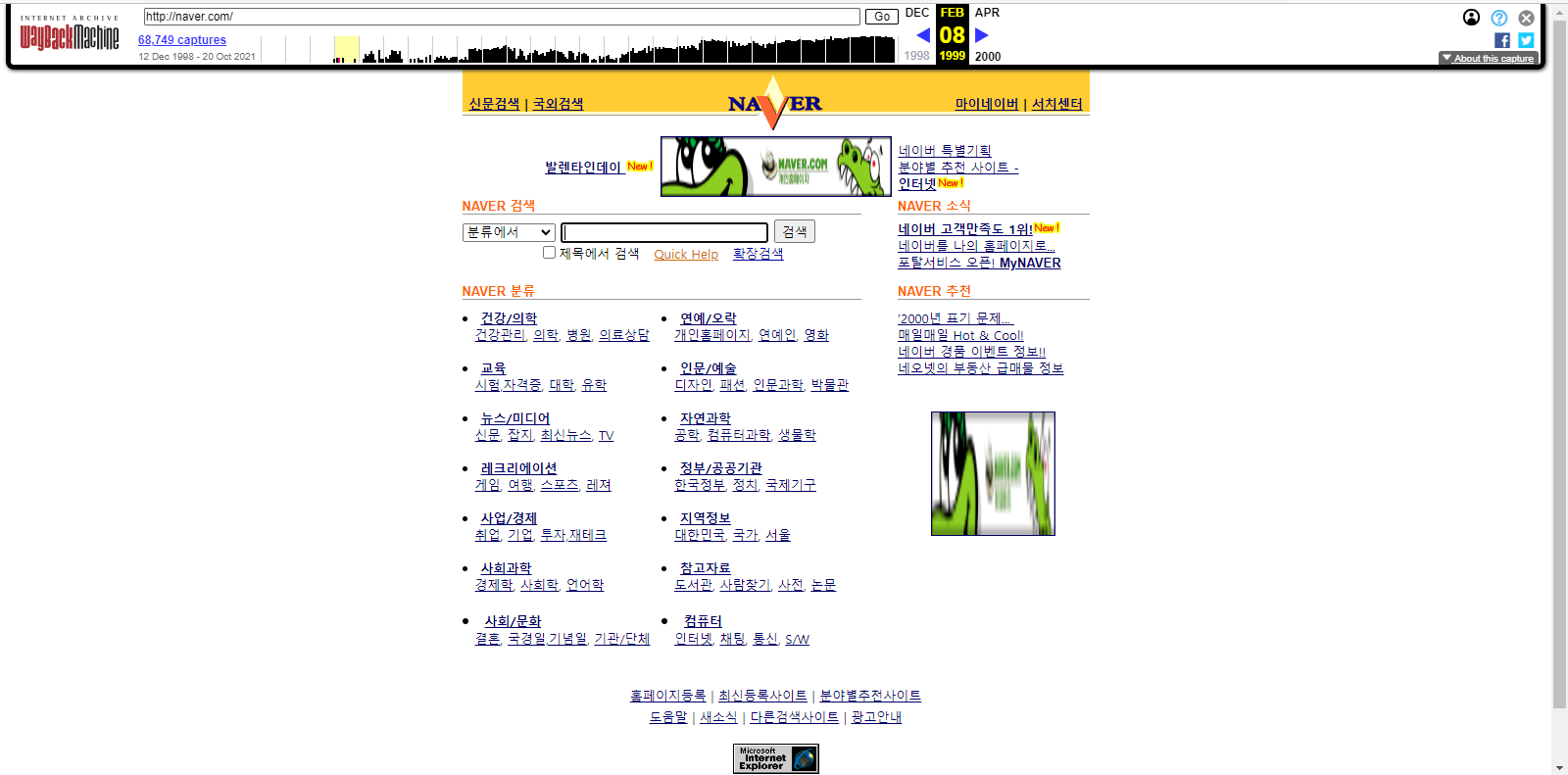 지금의 네이버와는 완전히 딴판이군요! 그런데 아카이브의 목적은 따로 있죠. 삭제된 게시글을 찾아내는데 이용 할 수가 있습니다. 예를 들면 디시나 루리웹 대형 커뮤니티 사이트의 글들을 찾아내고 싶다면 이 사이트를 이용하면 됩니다.
