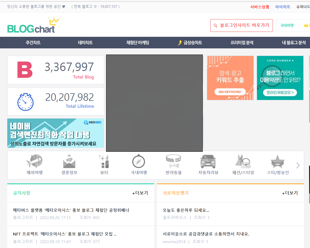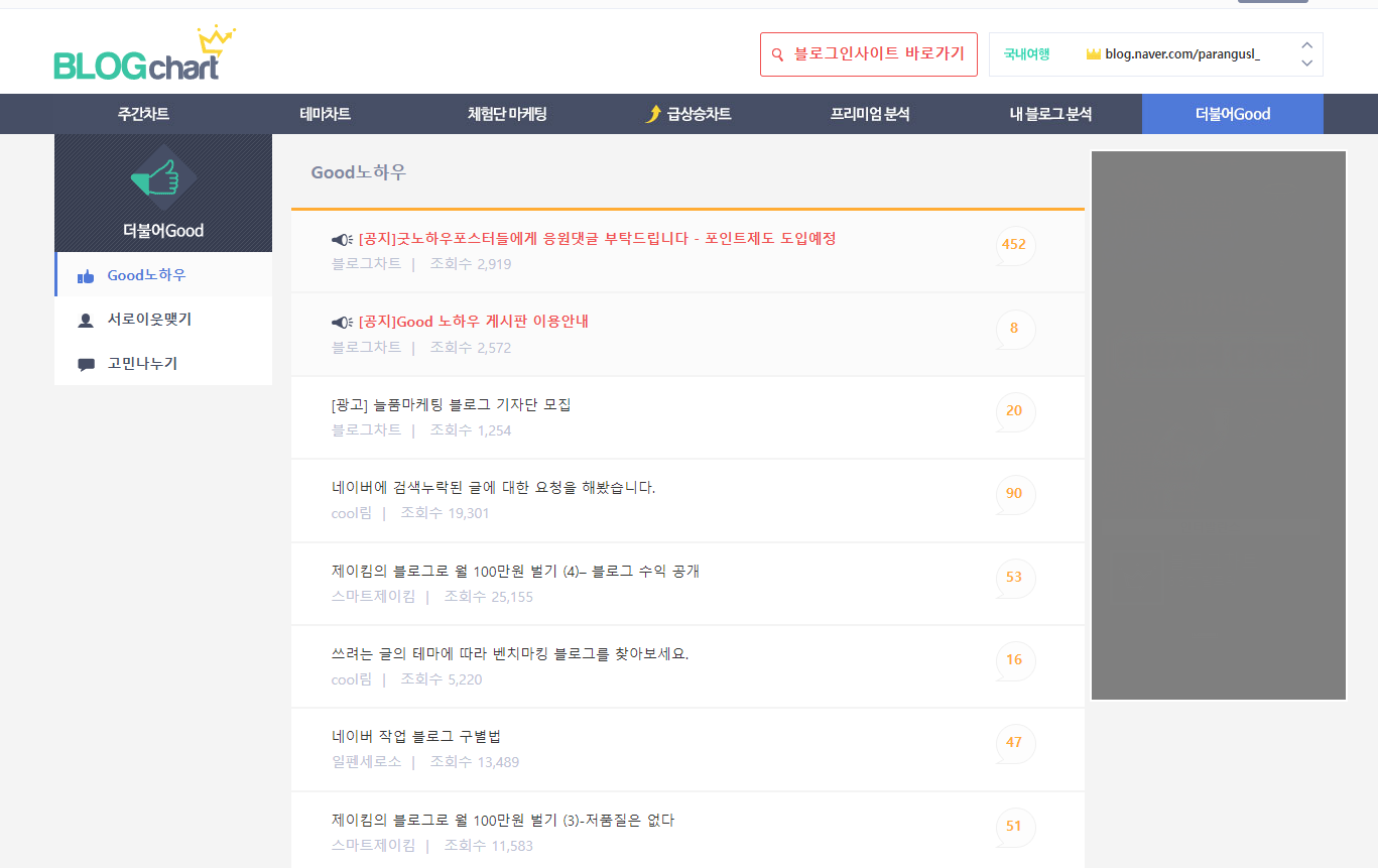 블로그차트 처음 블로그 하는분들이라면 꼭 들려봐야 될 곳 중 하나죠. 블로거머니와 함께 블로거들에게 특급 정보를 주는 곳입니다.